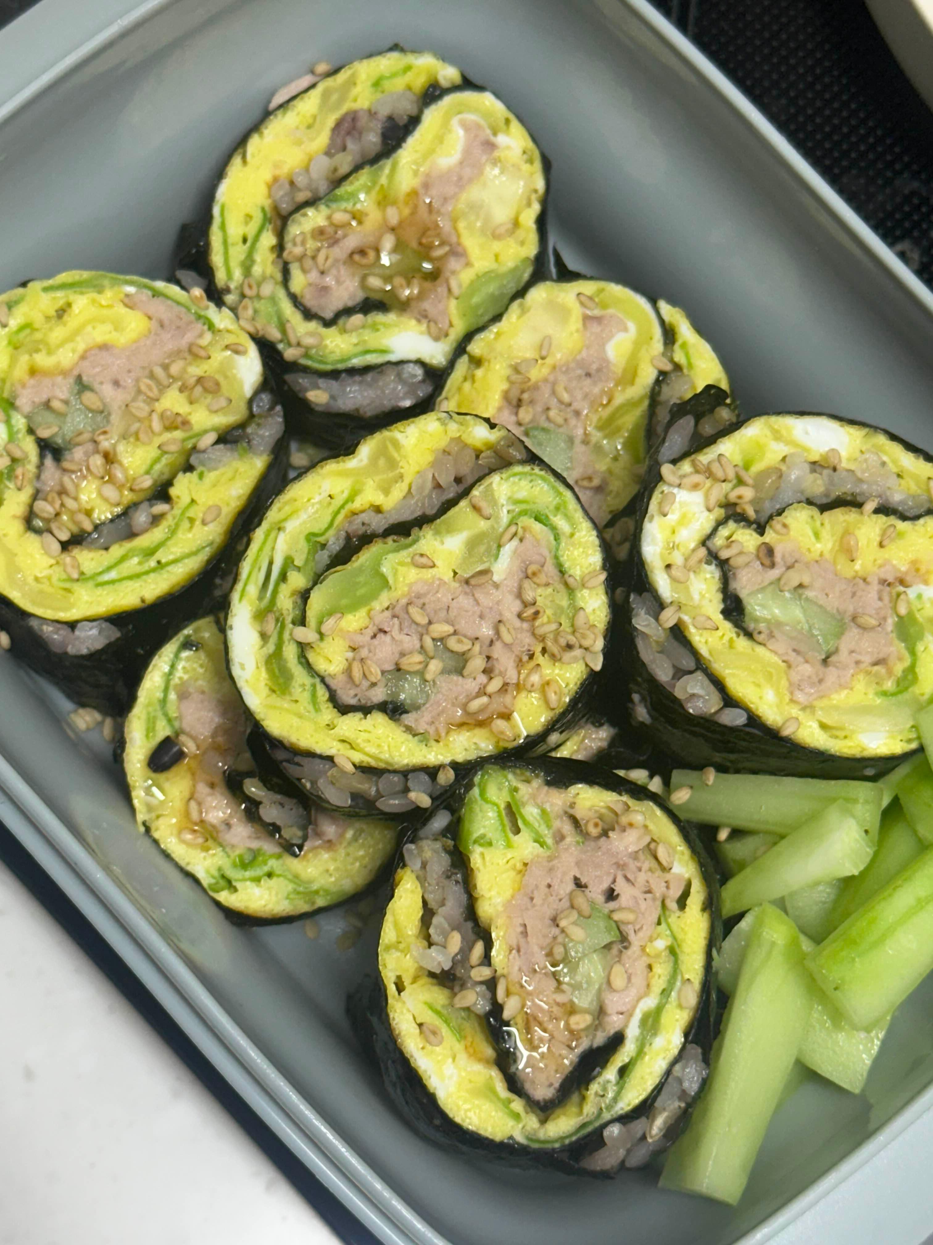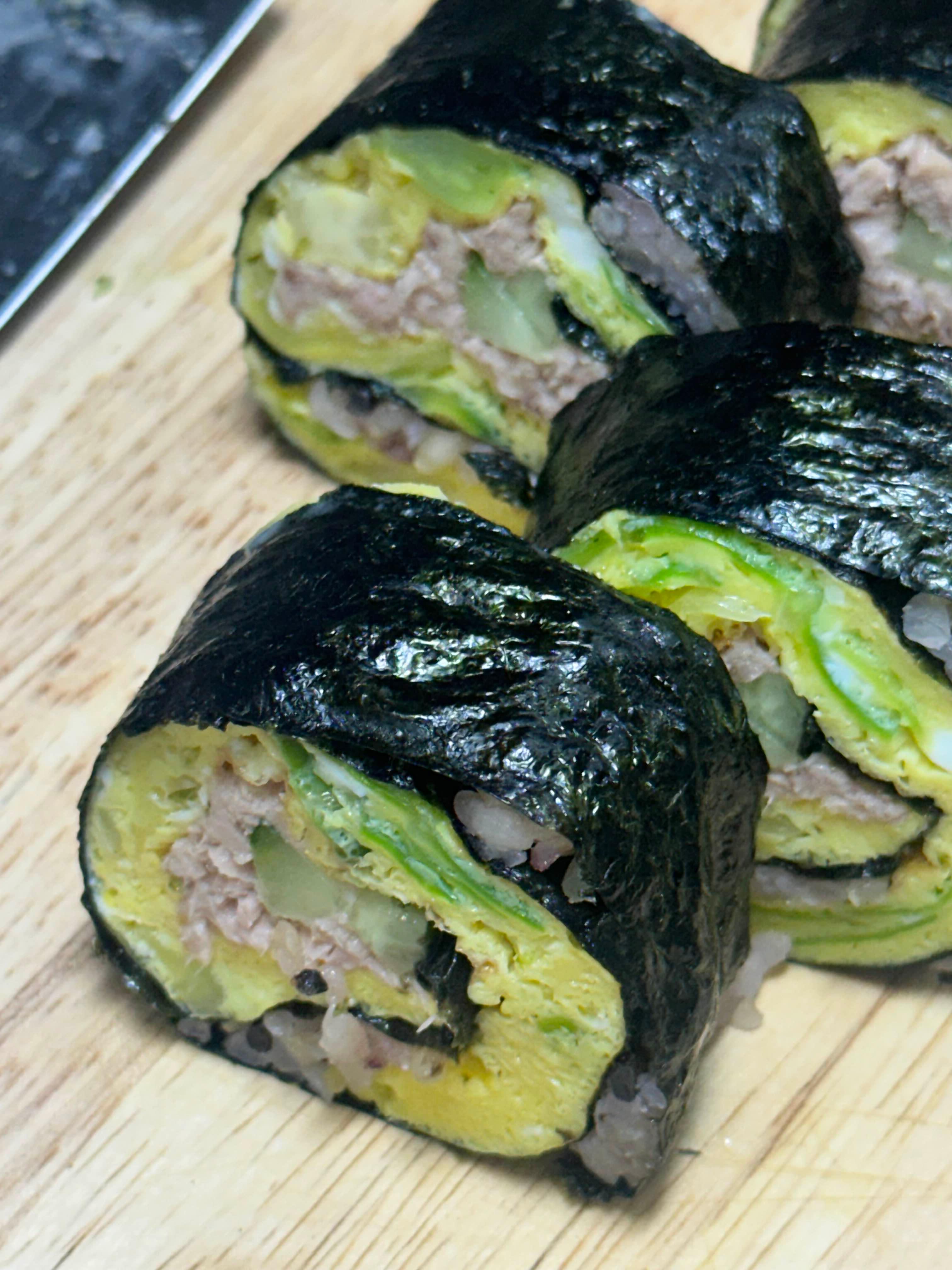 김밥을 말때 주의사항은 참치를 너무 많이 넣으면 마는 과정에서 많이 튀어나오니 적당히 넣어주는 걸 추천합니다. 또한 오이는 많이 넣을 수록 수분감이 있어서 좋더라고요.