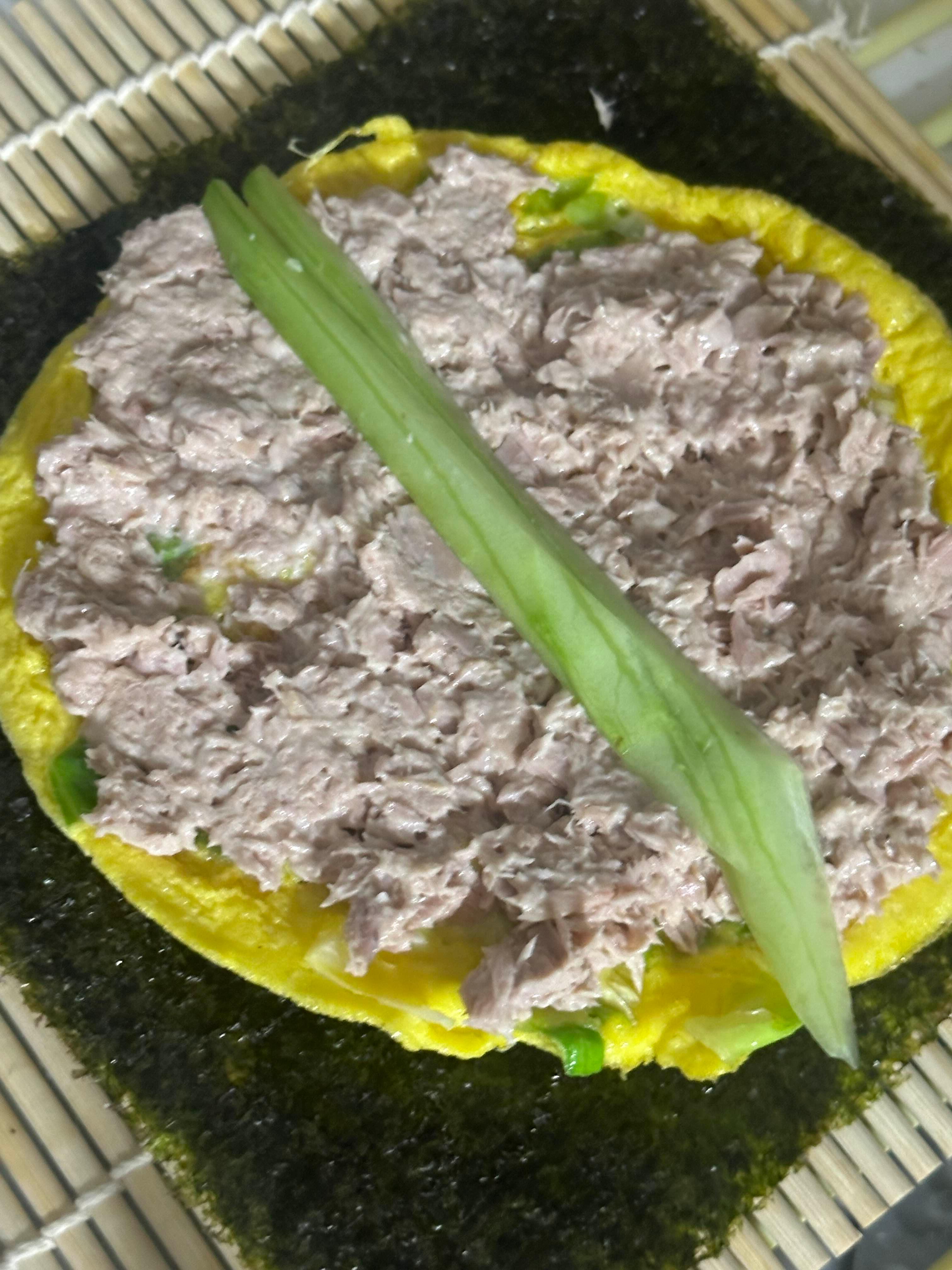 6) 김밥말이 위에 김, 계란, 참치, 오이 순으로 올려주고 맙니다.