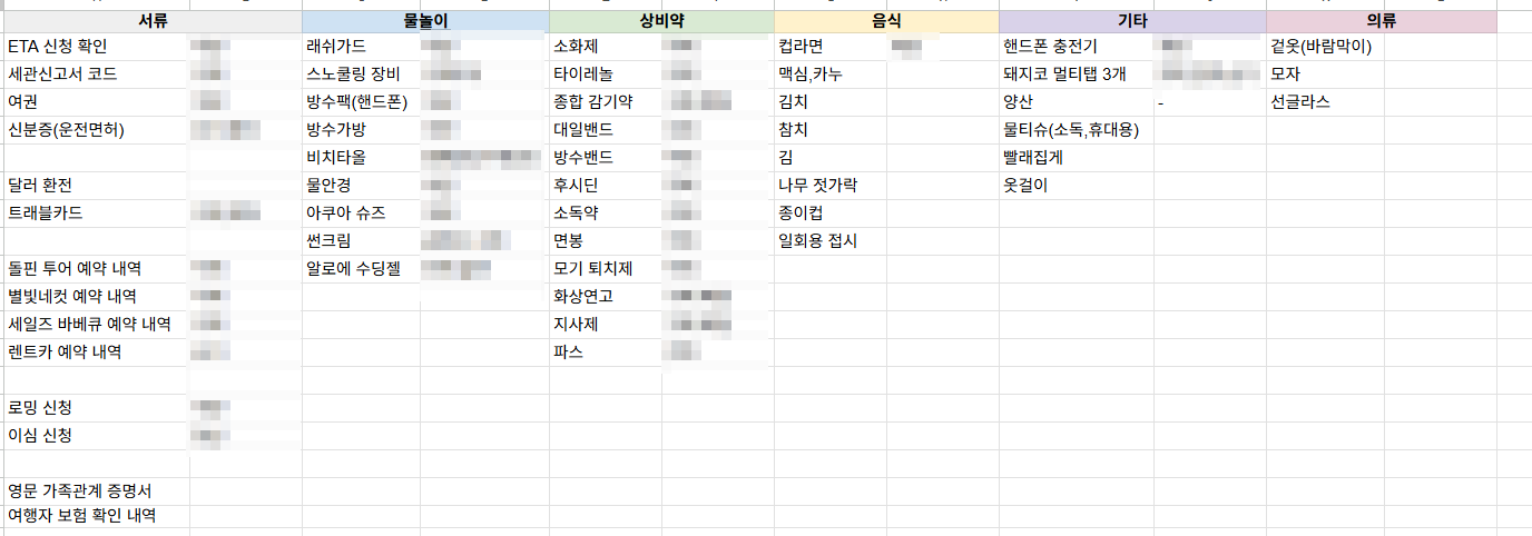 모자이크 처리 된 부분은 저희 가족의 담당자의 이름이 적혀있어요! 사실 일반 여행가듯이 개인의 스타일에 맞게 준비물을 챙기면 됩니다만, 물놀이 할때와 스노쿨링을 고려하신다면 장비도 챙기면 좋습니다. (대부분 스노쿨링 업체에 있겠지만 개인용품이 더 위생적이니까요.)