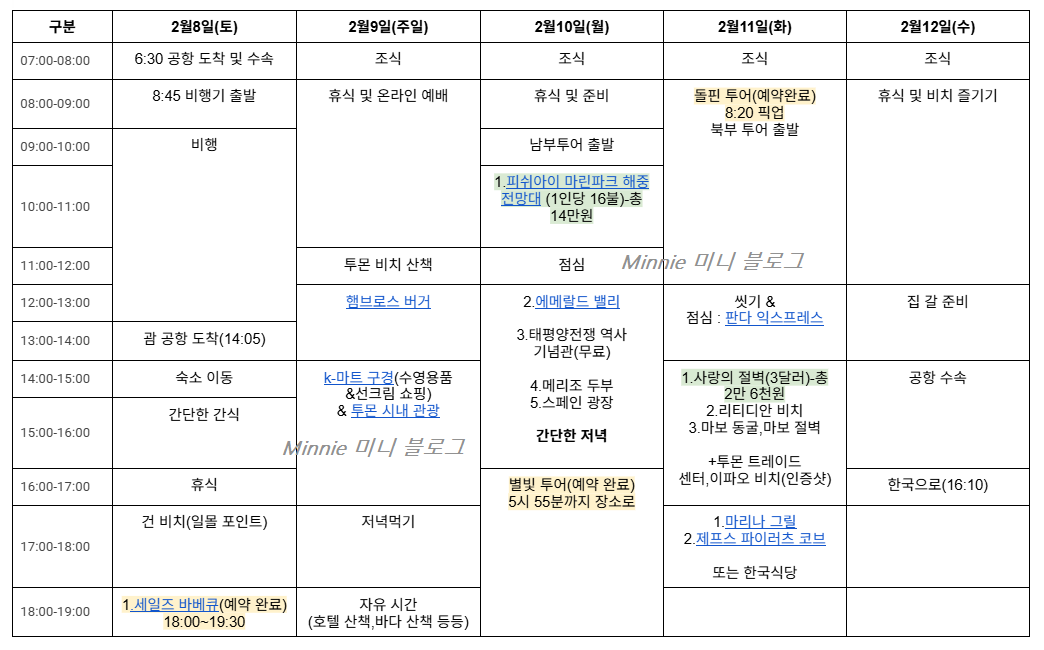 4박5일의 일정은 이렇습니다. 괌은 규모가 작기때문에 차로 이동을 크게 하지 않아도 된답니다. 개인 일정과 날씨에 맞게 일정을 변경하는게 꽤나 유동적이니 참고하시길 바랍니다.