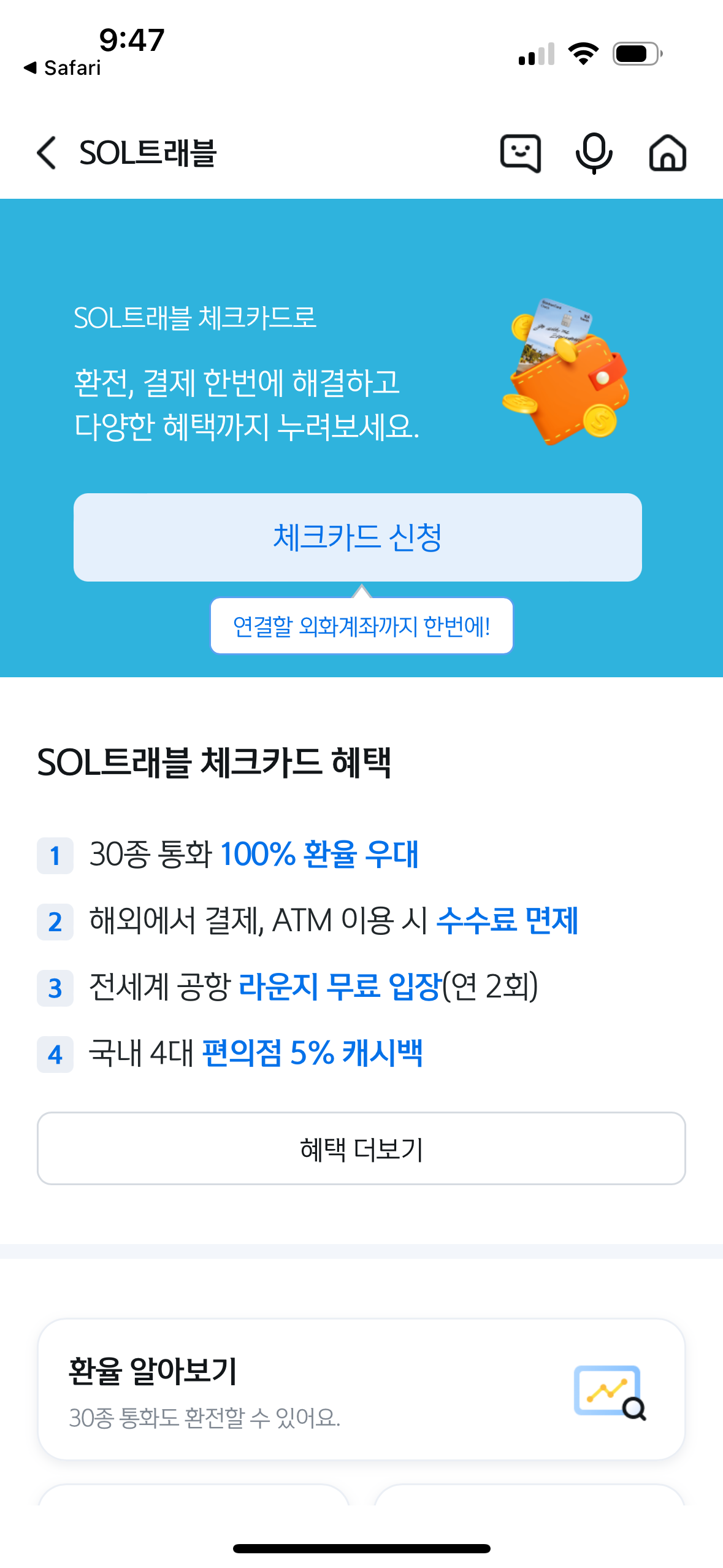 검색>트래블>SL트래블메인화면>체크카드 신청>완료