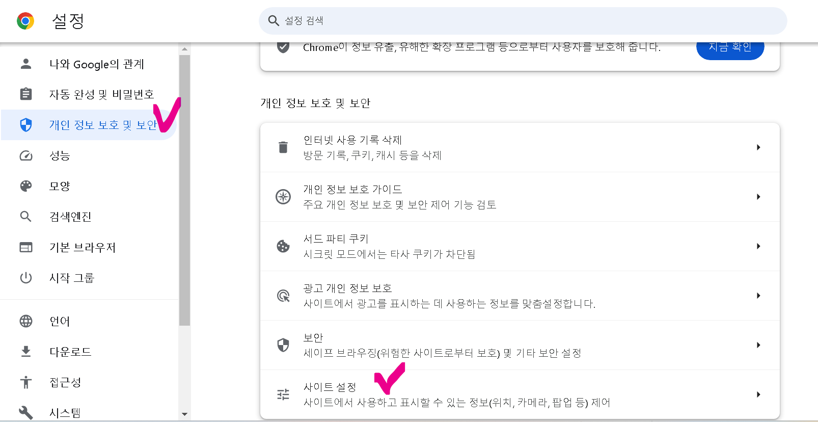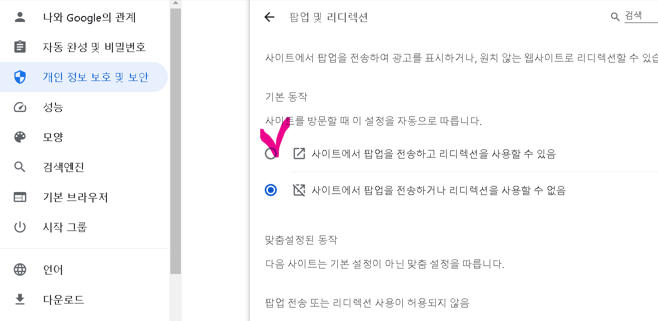 팝업 및 리디렉션 > 사이트에서 팝업을 전송하고 리디렉션을 사용할 수 있음 변경