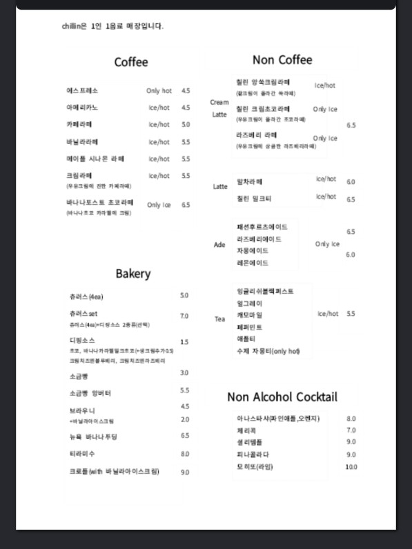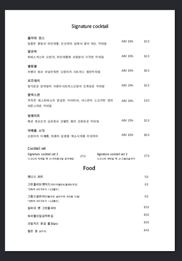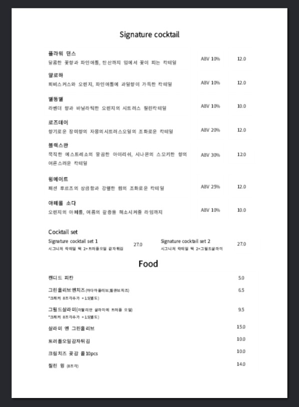 메뉴는 커피, 디저트부터 칵테일, 맥주까지 모두 있어서 취향에 맞춰 커피와 술을 즐길 수 있습니다.