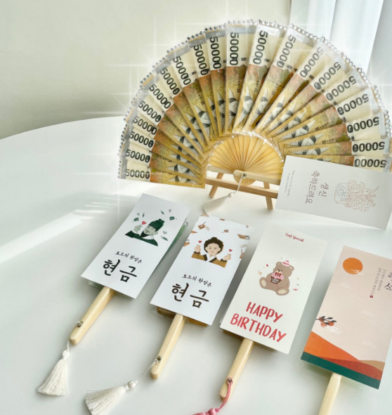 부모님께서 돈으로 부채질 하는 액션을 보고싶은 분들께 또 다른 귀여운 선물인 용돈 부채를 추천해드립니다. 부채 형태를 구매하시고 비닐 틀에 준비된 현금을 꽂기만 하면 현금 부채가 완성이 됩니다. 부모님께서 용돈 부채를 사용하실 때 가족들 모두 재밌게 웃을 수 있는 이벤트가 될 수 있습니다.