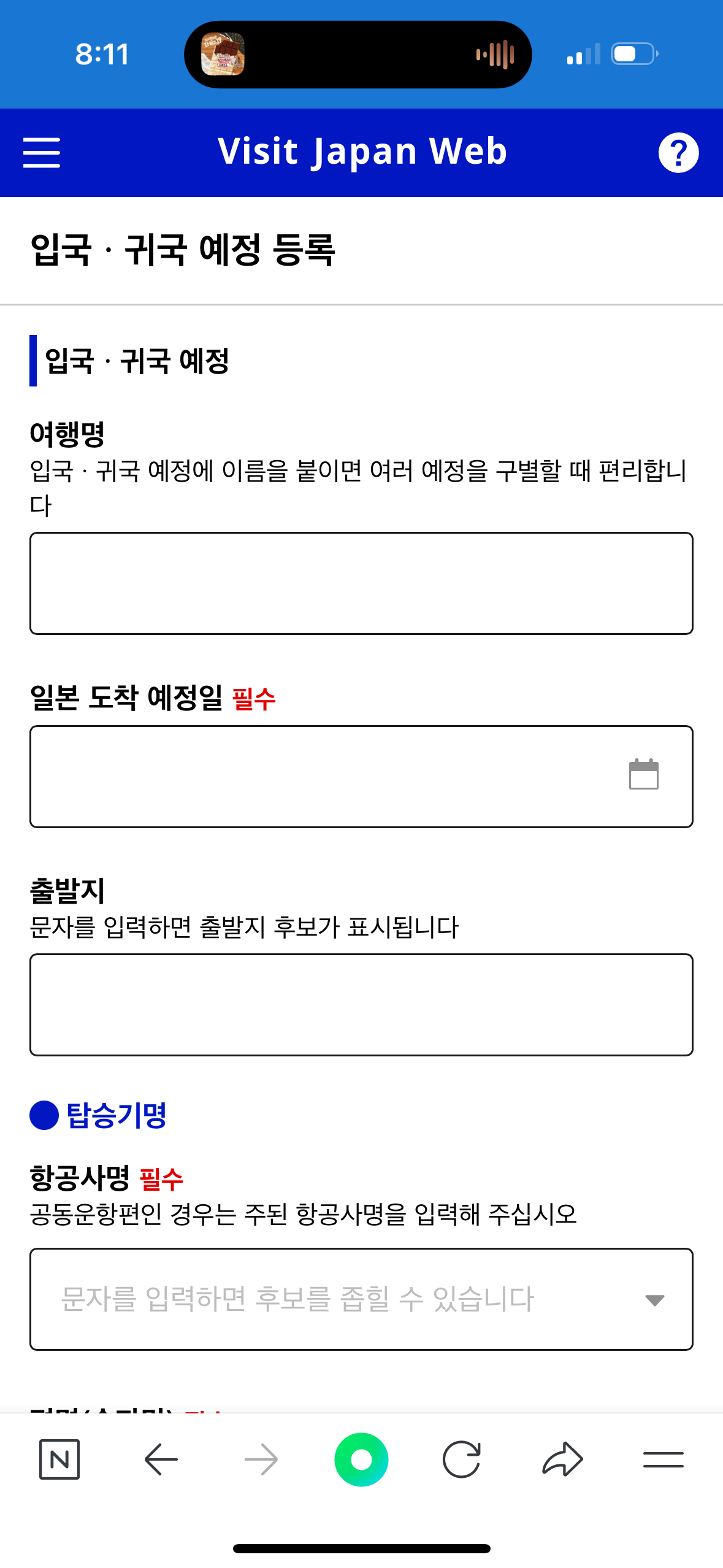 5. 일본 도착 예정일, 출발지, 탑승기 정보, 숙박할 곳 정보 등록