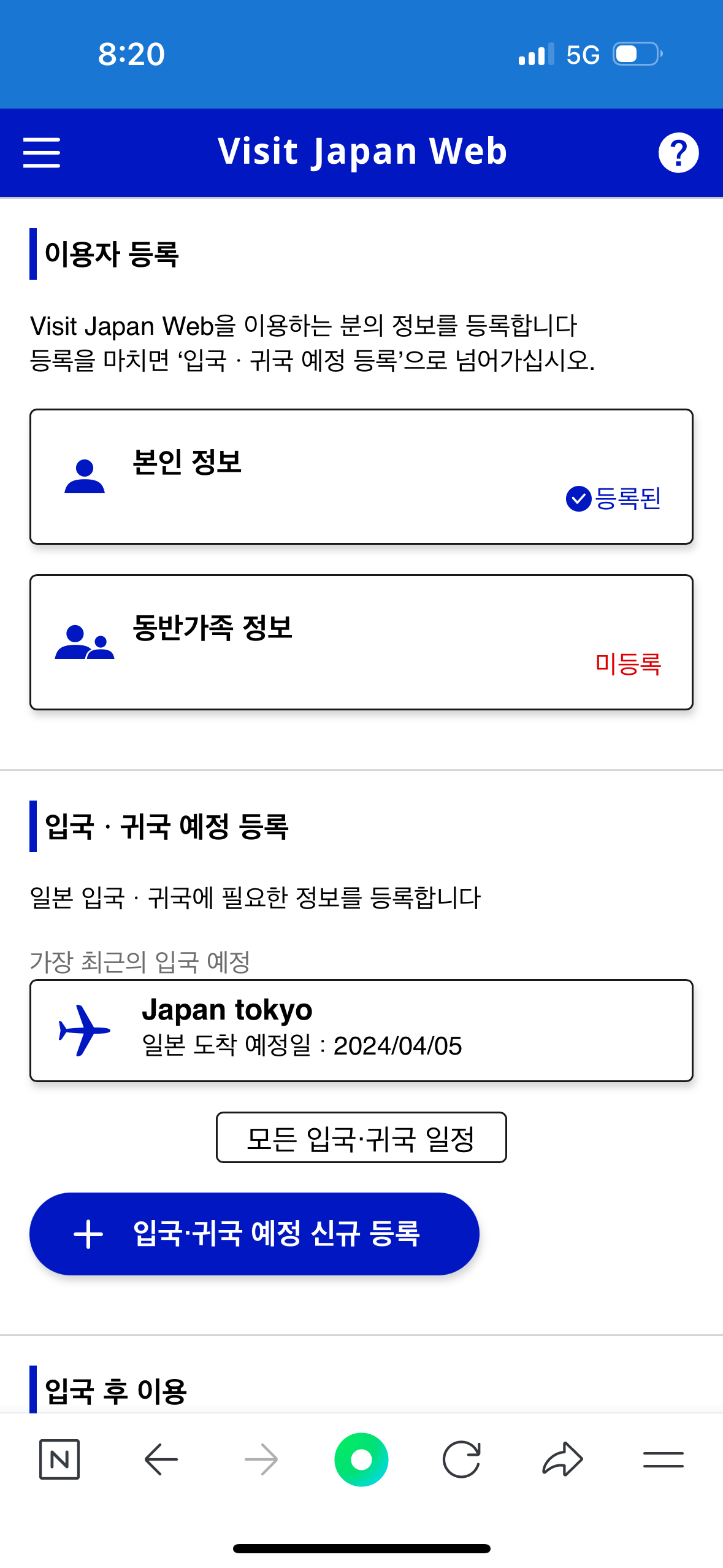6. 동반가족이 있다면 정보를 등록하고, 없다면 본인 정보 등록 완료와 함께 입국, 귀국 예정은 등록되었습니다.
