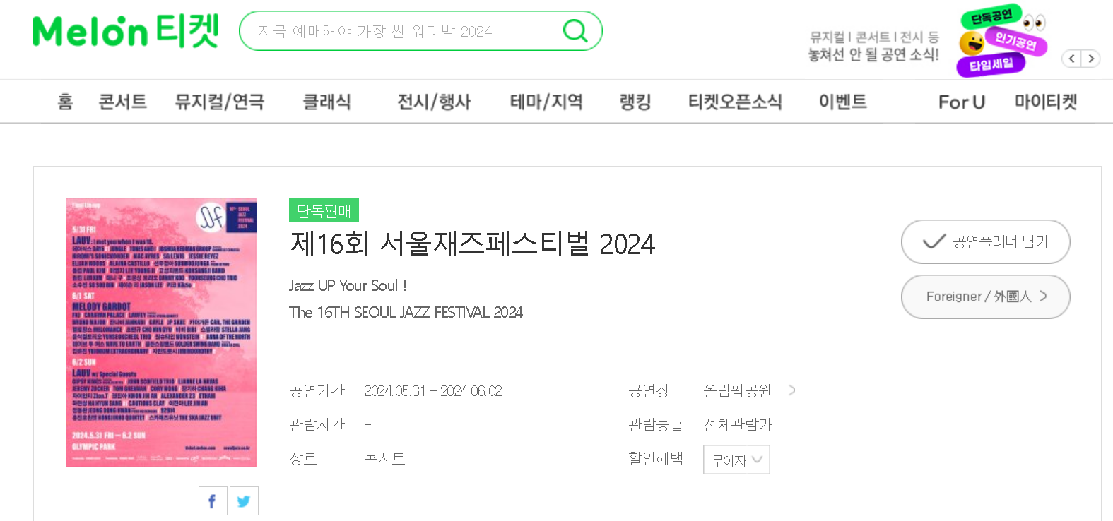 서울재즈페스티벌의 예매처는 '멜론티켓'입니다.