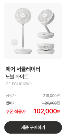 개인적으로 가장 맘에드는 제품은 쿠쿠 에어서큘레이터 노블 화이트입니다. 무엇보다 '캠핑용 에어서큘레이터'로 휴대가 가능하다는 점과 무선 서큘레이터라는 점에서 작은 원룸에도 좋으며 10만원으로 비교적 저렴하게 구매가 가능합니다. 폴더블과 무선이라는 것이 가장큰 장점입니다.