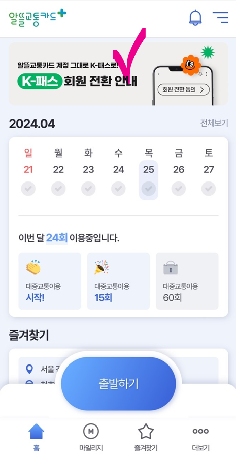 *알뜰교통카드 어플에서 상단의 K-패스 회원 전환 안내를 클릭합니다.