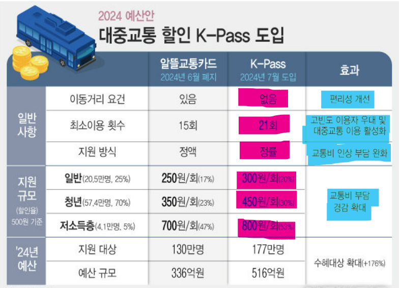 K-PASS는 정부가 국민의 대중교통비 부담을 대폭 완화하고자 민생 회복을 위해 만든 정책입니다. 24년도 5월 1일부터 시행되며 '월 15회' 이상 정기적으로 시내버스와 지하철과 같은 대중교통을 이용할 경우, 지출금액의 일정비율(일반인 20%, 청년층 30%, 저소득층 53%)을 다음달에 돌려받는 제도입니다.