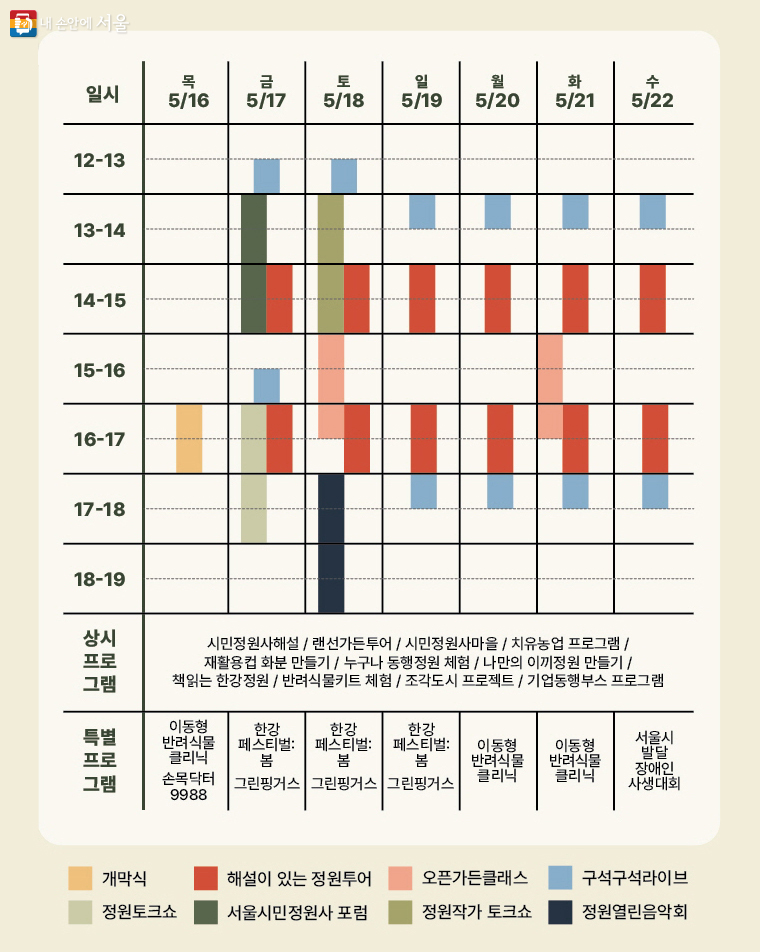 운영 시간: 뚝섬한강공원 특성상 언제든지 정원관람 가능, 그러나 정원문화 프로그램 등은 박람회 운영시간에만 진행됨 (가든센터의 경우 운영시간보다 2시간 일찍 시작해 10:00~19:00 확대 운영됨)