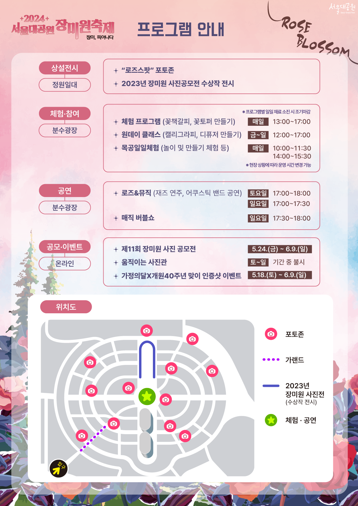 | 내용 | ✔ "로즈스팟" 포토존 ✔ 2023년 장미원 사진공모전 수상작 전시 |
