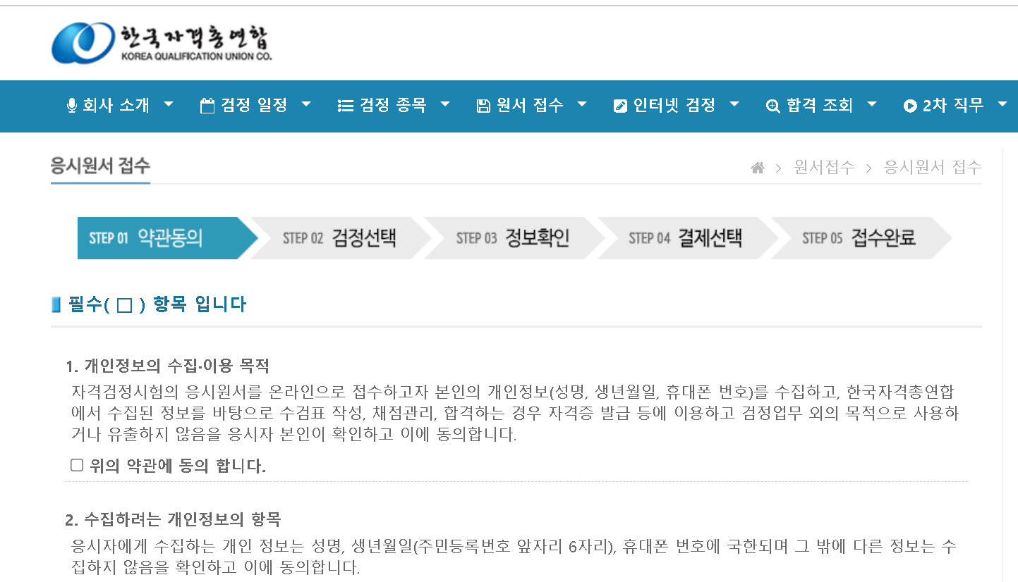 상기 사이트 접수 후 [원서 접수] 메뉴를 클릭합니다. 이 후 약관에 동의하고 검정을 선택한 뒤 접수를 완료하면 됩니다.