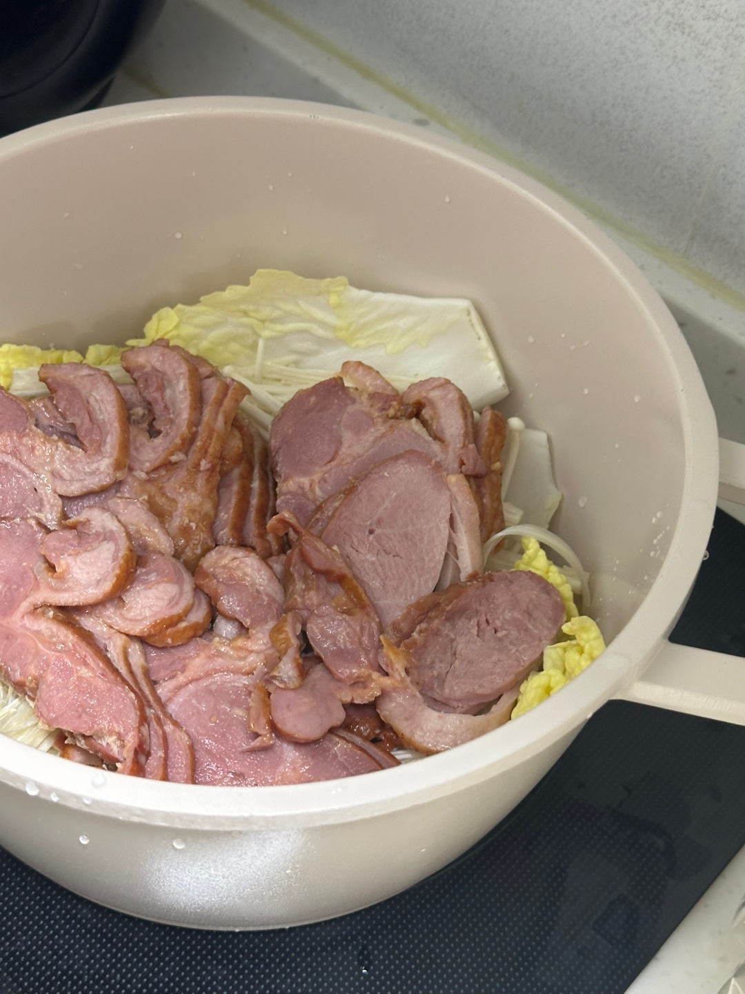 3. 그 위에 준비한 오리훈제를 1인, 2인 사람 수에 맞춰 적당히 넣어줍니다. 너무 많이 먹으면 다이어트에 도움됮 않으니 주의하세요