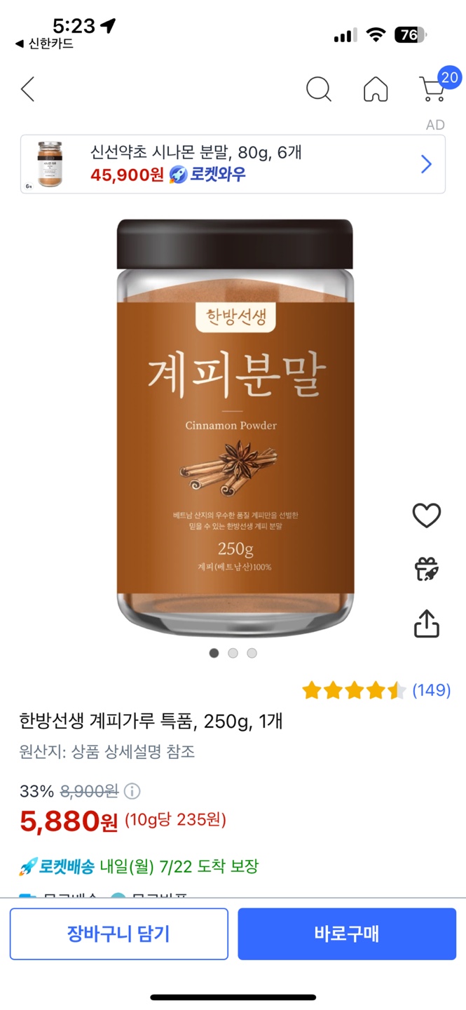 계피가루는 마트나 쿠팡에서 구매하시면 되는데요. 저는 막푸치노 외 사용할 일이 없어서 쿠팡에서 가장 저렴한걸로 구매했습니다. 위 제품을 주문했는데도 아주 많이 남았답니다.